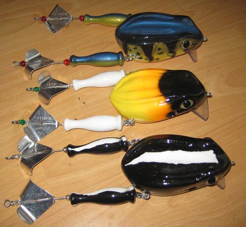 Still bored waiting for Spring thought I'd show some new baits. Some birds, small bass baits, 10" topwaters, 4 new monster Bullfrogs and some shads. Hope you like them.