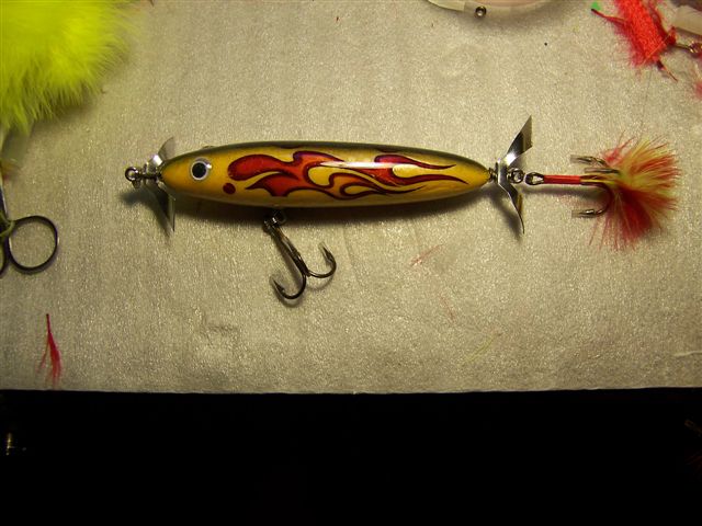 | Jump to page : 1 Now viewing page 1 [30 messages per page] More Muskie Fishing -> Basement Baits and Custom Lure Painting -> One of my latest duel chopper prop Topwaters. |