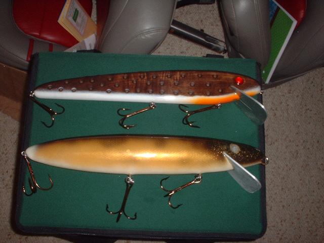 Sadly, six monthes of unemployment have forced me to sell some lures that i never thought i would get rid of. My friend Duff Thury (Capt. Bigfish) makes these two trolling baits. The top lure is a Neptune (18" lure with aluminum lip) that is a grandma style in a natural finish with texture.