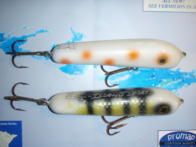 The Pearl/Orange Dot is a "00" and the White Okoboji Perch is a "01" from Kurt's Island Sports in Minoqua. Both baits have some scuffs but little to no use. $70 each shipped within the U.S, OR $120 for the PAIR shipped. Check or money order preferred. Thanks.