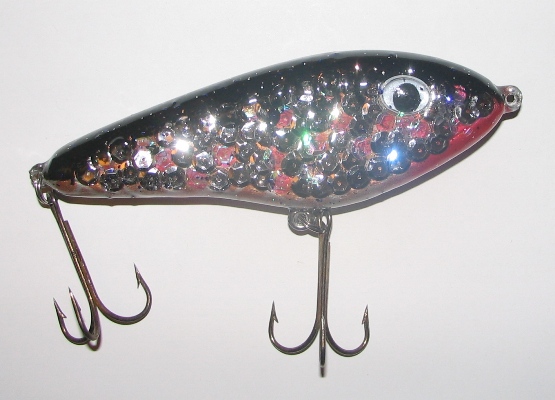 The epoxy went on just fine tacklebooty. I didn't turn the lure, because there were a lot of little pockets that I wanted to make sure got filled when I coated it. I overlapped the sequins towards the back, like scales would be. Then I hung it from the tail and coated it from tail to nose, so all the gaps got filled. Then I just kept recoating it in the opposite direction each time so that there wouldn't be a buildup on the front or back end of the lure that would change the way the bait worked. Worked out just fine.