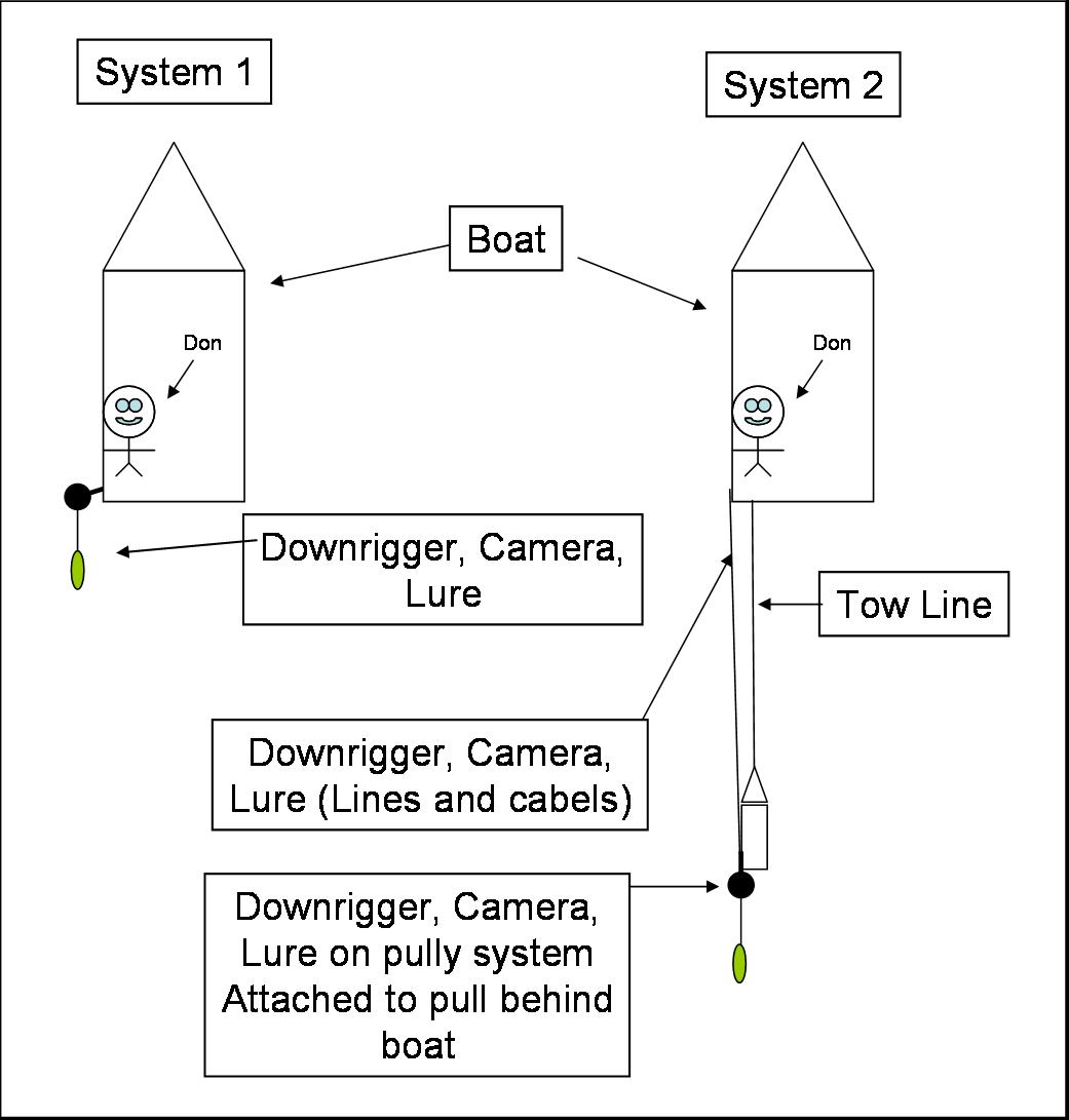 I think it would be real cool too if you got one of Steve's hydrophones too. Real cool too if you could add a small display in one of the corners of your TV screen shot showing the actual acoustics/intensity of the lure while running. May not be possible when you running next to a running engine and prop though Could always make a giant planner board or tow a small rig/boat behind that your downrigger/camera/line go back to and run it though a pulley system so you can still adjust depth. This would also give you the heads up on any structure you need to adjust for as you would see it on your depth finder 10-20 feet before your downrigger/camera system gets to it. Need to draw some pictures as I suck describing things. See attached.