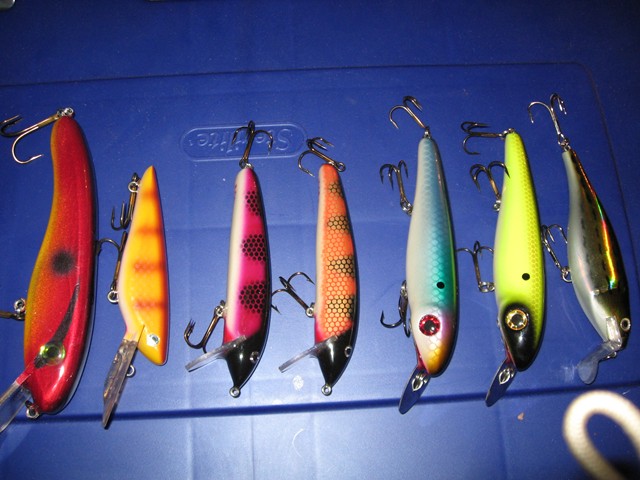 Pounder Bulldawg, PET spoon, Bunker spoon, Howie (self made - couldn't find one at the shows), Mr Wiggly, TS Takin' Popper, Ducktail double bladed spinner's (red/yellow is keel weighted), Zam 22CM, Slammer Deep Diver, Zam Z, Spanky magnum double blade spinner, ZaltNAD "PI Deep-Six" .
