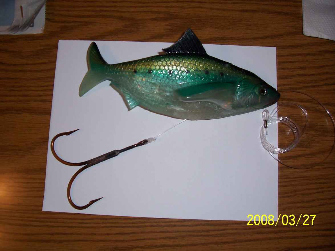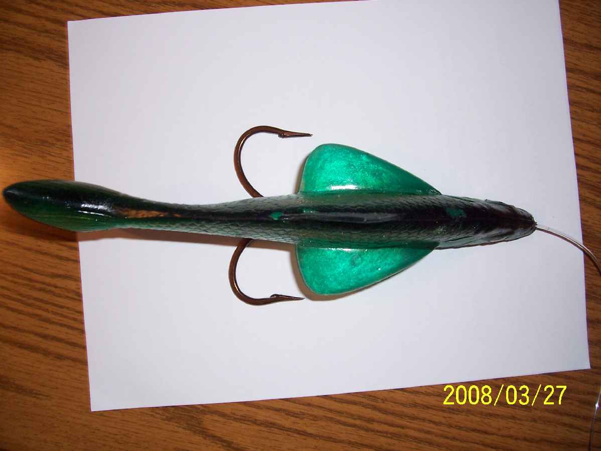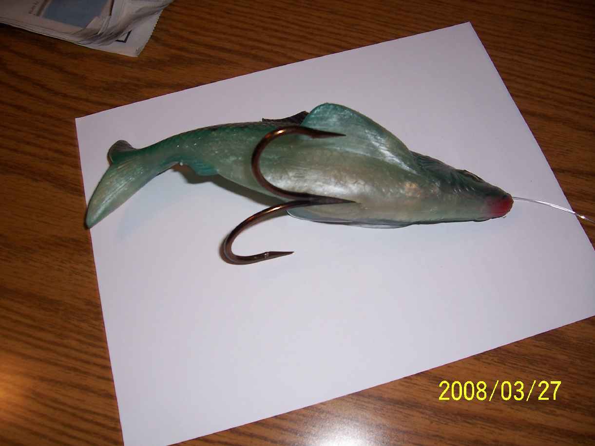 The rubber bait is a high speed saltwater trolling lure from South Africa. It's 10" long. I first tried this lure at the 2007 MF PI Outing. At the end of the 2007 PI outing I fished with Howie Meyer on Sunday, he kept my original-it had some serious teeth marks. The teeth marks came from a fish Spencer Berman raised on a 2lb Bulldawg on Saturday, i.e., 3-4 cast's later my rod loaded up, but no hooks into the fish. At Howie's suggestion, I've since modified it for better hooking on muskies, i.e., I've re-rigged it with a custom designed double 12/0 hook. Therefore, I think I'll call it the "PI Deep-Six" after Howie's penchant for chasing deepwater big fish in late fall, i.e., it's designed to be deep-six'd, or run over rocks, bottom etc. and still be relatively snag free. It can be fished anywhere from 3' to +60'. As rigged from the manufacturer it's very heavy, i.e., it sinks at ~5'-8' ft/sec. I'm now working on different weights.