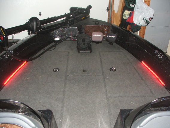 I did the same thing to Rick's boat a couple weeks ago. I put LEDs on both sides of the front deck and both sides of the back deck. Also put them in the rod locker. I used 3M double-sided tape to secure the strips. It is a "night fishing machine". I'll post pics as soon as I get them. LED lights draw way less power than the regular lights.