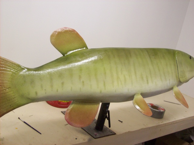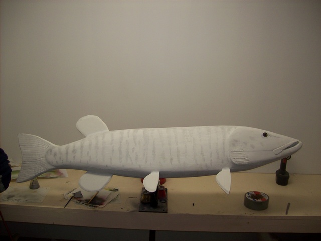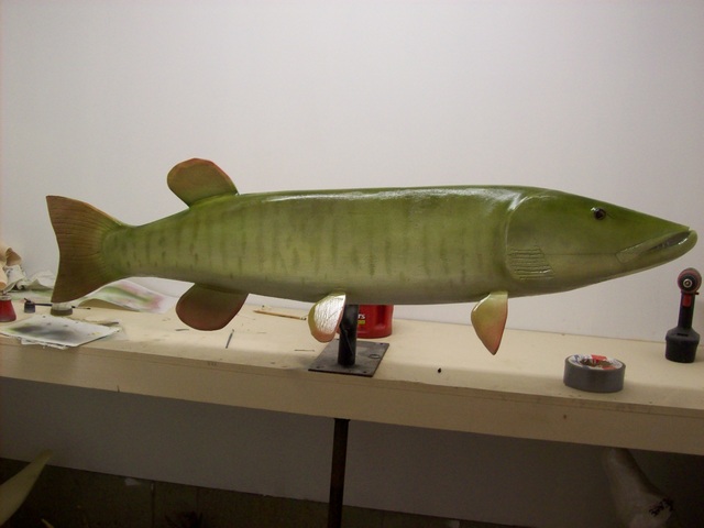 Posts: 294 Location: Bloomer, Wi | I was really hoping to catch a replica worthy musky last year so I could have a big musky on the wall , but when I didnt I thought this would be cool to try. We have so many deer heads that you dont realize a musky hunter lives here too. and the fins are made out of cedar they were glued on seperatly. | ||