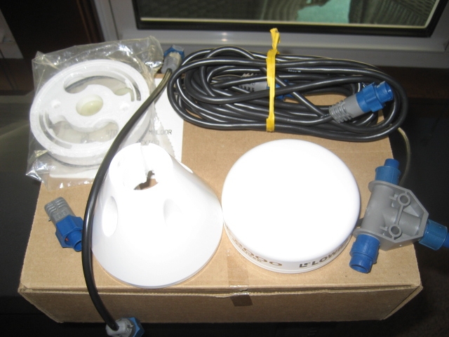 NEW lowrance lgc 2000 gps antenna set-up, comes with gps antenna, 1 foot ext. cord, 16 foot extension cord, mounting cone, network t connector, terminating plug, and in the pic back left corner, mount you can remove your gps antenna when not in use.