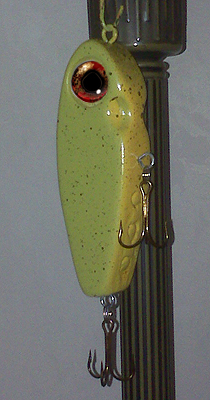 Top bait rocks back and forth when reeled in. Swims about 3-4 feet under the surface.