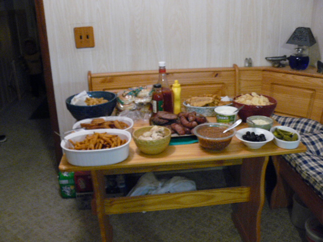 Posts: 32954 Location: Rhinelander, Wisconsin | Sue and I have dinner ready and waiting for the crew to arrive. Perch, crappie and pike fillets, Venison Bacon burgers, Venison Cheese Brats, good old beefburgers all on the grill for the less than adventurous and fixins await the anglers. We stayed off the water after figuring out what needed to be cooked and prepared; the fire is going if thundershowers don't snuff out the Ring tonight.....bet you wish you made the Outing now, huh? How about fresh, homemade rhubarb pie for dessert? Report and a few pictures later. | ||