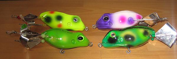 Posts: 309 Location: canada | yes you are correct on both observations, flowing water, and the legs are at a down ward angle, with a clock and counter clock wise blade, ass weighted, to sit like a real frog, only the the head sticks out of the water while at rest, then you pop/ jerk retrive it back in, or you could just crank it back in. Etch | ||