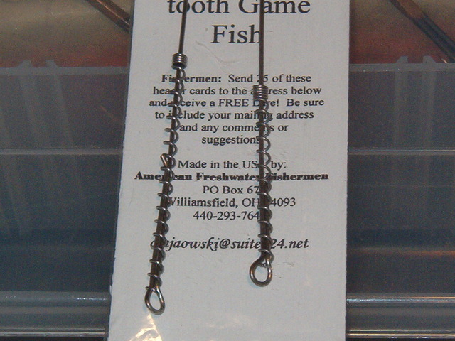 mota I figured you were more interested in the baits than leaders, but here are some pics of leaders I got at the Butler Fishing Show. 10" Steel leader with Posylock spring. Made by American Freshwater Fishermen email: [email protected]