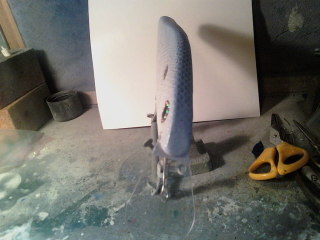 | This is my first attempt at foiling a bait, my biggest bait so far-9 1/2" w/o lip, and not really "foil" persay but a piece of clear pearl plastic sheeting over some thin scaling material. I also sprayed this one with the white/lt.blue/silver/dk.gray/dk.blue scales that I did the other few in. I think this type of paint pattern is really going to be effective, because it shows the different dimensions of the fish's color. Regular paint seems almost one dimensional, most of the flash coming from movement. This lure flashes when you look at it from different angles, let alone when you actually run it and it wobbles. I talk to alot of guys who makes baits and they say you need an airbrush and I agree, but these are pretty unique IMO.