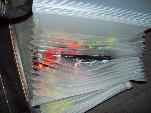 Het Scott, I use one of my kids old nylon lunchboxes with a zipper all the way around it! It actually works pretty good. I kinda lay the baits all the same direction and take my time getting them out and putting them away1 I bought 6 new spinnerbaits from River Rat Lures one day, and was on my way fishing and I thought to myself, what the heck am I gonna do with these big things. I looked over and saw the lunchbox and thats where they been ever since! Thats fishin REDNECK style with muskie24/7...LOL