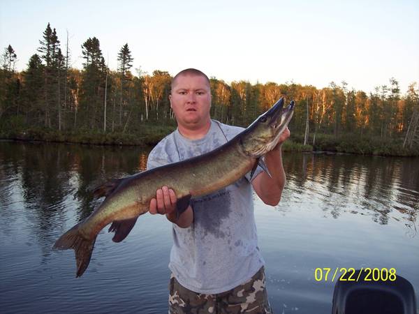 Finally after 2 years of hard fishing and 4 lost fish (2 of which were rite at the boat), I boated my first musky in Northern Wisconsin! A beautiful dark stained water 38.5! The next nite, only fishing for 10 minutes, I boated my 2nd fish, a nice 36 incher! Here is the 38.5, caught on an orange cowgirl!!