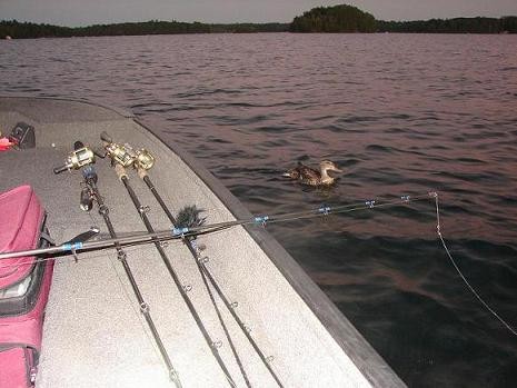 Location: Twin Cities | jonnysled - 8/18/2008 5:04 AM last night at dusk i'm standing on my casting deck and just enjoying a nice evening and i look out in front of me and there's a duck flying my way. i watched it no big deal right? ... then all of a sudden i'm figuring out this duck is coming right at me ... i mean right at my head full speed and not stopping so just at the last moment i duck (lol .. no kidding ... as in dive to the deck duck!) and it flares it's wings, freaks out and dodges me and then lands in the water near the boat and proceeds to swim toward the boat like i'm it's long lost buddy ... absolutely wants to be right next to me and the boat. Sounds like someone found a baby and fed it....d'oh. | ||