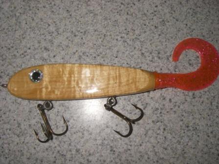 What I'm doing is creating a special Regular Muskie Treat in the color "Naked Cheerleader". It's a clear coated bait that has the "tiger maple" effect in the wood grain. It's topped off with a pink tail (pom-pom) and green eyes (who doesn't like green eyed cheerleaders?). I will never have these baits for sale save for benefit auctions. You're bait can be personalized as you wish. The auction will end this Saturday whenever I get my butt out of bed to see who had the highest bid.