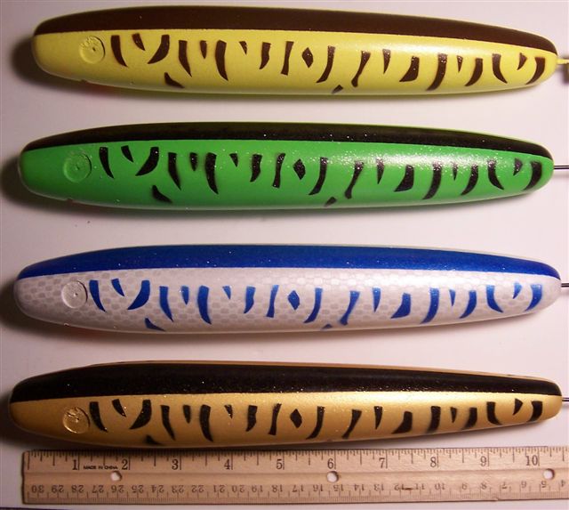 Posts: 235 | Hi there, just finished up the first small batch of the newest member of the MuskieBurger family of handcrafted Muskie baits. Let me know what you think of these. A guide tested one of these on Green Bay and said they troll well. Thats what I wanted to hear. All comments are welcome as this is the only way I can improve my baits. Thanks Steve for your sugguestion not to dress the rear trebles, especially on smaller baits as it affects the action. So lets hear some comments. Thanks for taking the time to look at my baits. Ken Schmitz Attachments ---------------- Baby_MuskieBurgers_1.jpg (64KB - 110 downloads) Baby_MuskieBurgers_2.jpg (47KB - 95 downloads) Baby_MuskieBurgers_3.jpg (47KB - 104 downloads) | ||