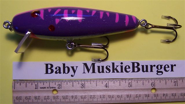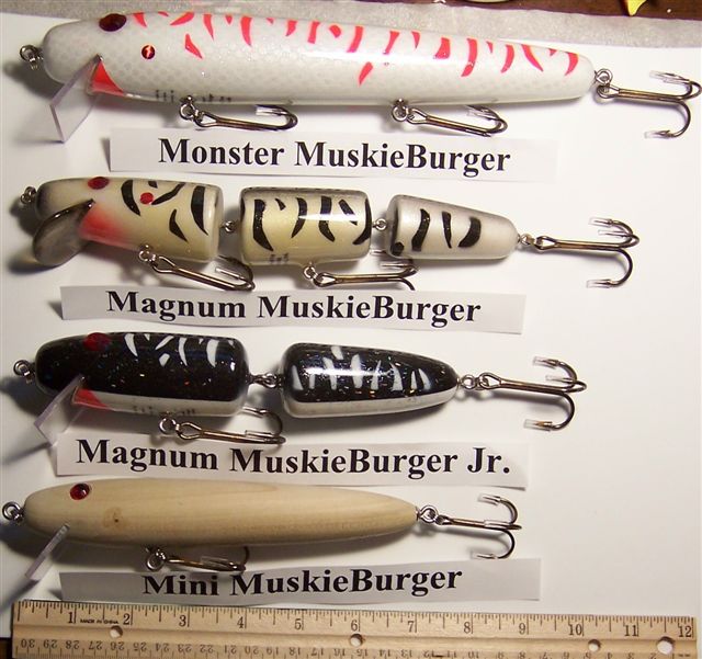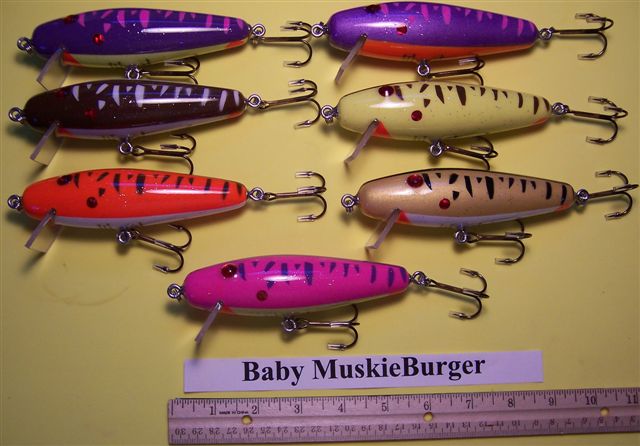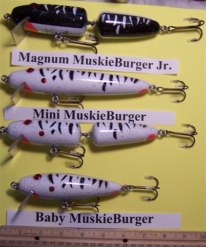 Posts: 235 | Well when they told me bigger is better I came out with the Monster MuskieBurger. Then I'm told they don't always like big baits so I came up with the two newest and smallest baits. The Mini MuskieBurger and the Baby MuskieBurger. Also I will show a comparison picture of the different sizes. Attachments ---------------- New_Mini_&_Baby_MuskieBurgers.jpg (51KB - 106 downloads) MuskieBurger comparison.jpg (85KB - 103 downloads) | ||