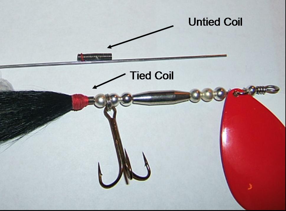 Location: Land of the Musky | Here are two pictures I dug up. Both show either a coil or a lure body that you can use to tie your skirt material onto. I like the coils myself as they have the "grabbing" of the coil and the coils themselves are not heavy so you can add the weight where you want to. I like having more weight in the tail of the lures myself. I think each configuration has its advantages and some disadvantages. Make a lot and test them, save some money, and have fun! Post some of your creations when you get them made.