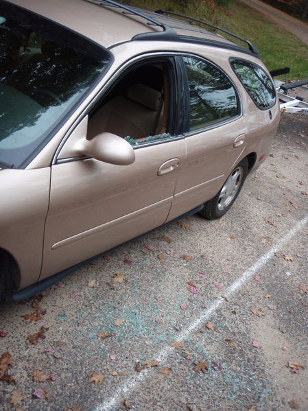 As we arrived to the scene, the driver side window of my tan Ford station wagon was busted into and completely shattered. With the large heavy rock sitting sitting on top and placed nicely onto my dashboard in hopes of possibly trying to make a statement, whoever the culprit was apparently forgot to steal all of the visible electronics consisting of radar detector, I-pod, and other gadgets.... Also, we couldn't believe that he bypassed the 5 large plano stowaways sitting covered in my trunk with hundreds and hundreds of dollars worth of musky baits.. Rather than take those items, he went for my 3 Musky rods and reels, and my friend's one rod and reel combo.