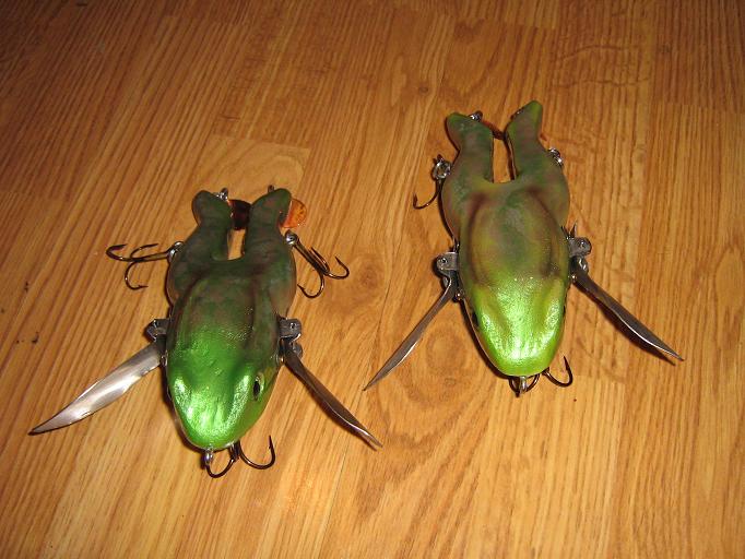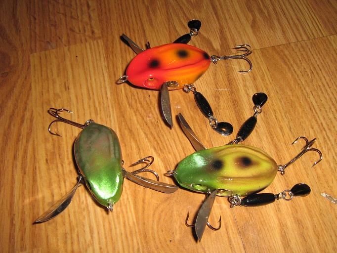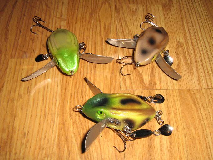 Thought I'd show some new crawlers. Small 3" frogs fixed wings. Also a couple 4" creeper frogs. Two 6" loons, Two 6" chipmunk popper creepers, as well as two monster Bullfrog creepers and some 2 1/2" Bass swimmers.