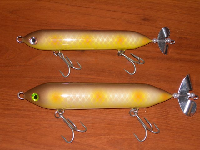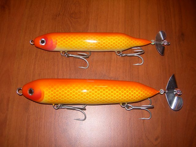 Posts: 26 | Wanna Ski - 10/16/2008 10:46 PM Not sure if you painted those hooks or are they some kind of salt water thing? They look like somthing that comes on the bigger Raps. But with the fish you have out there you might, might want to beef up the hooks if It does't affect your action. Looks like they could be the next NEW big thing if they reach the hands of some of the gools hear in Wisc. Minn. area. Good job.[/QUOTE Wanna, the hooks are 4x 9626 vmc's. the specs on my lures are: the smaller one is 7 3/4" long and 1 3/4 oz. with 2/0 hook size. the larger one in 8 1/2" long and 3 1/4 oz with 3/0 hook size. both are wired through with stainless steel wire. my own custom hook hangers. they are epoxy filled, sealed, primed, painted and have two coats of top coat. I built these to catch striped bass from the river and surf up to 40,50lbs. But since it was suggested to me that my lures looked more geared towards muskies I can't wait to catch one after recently reading some articles and this website. Thanx for kind words. | ||