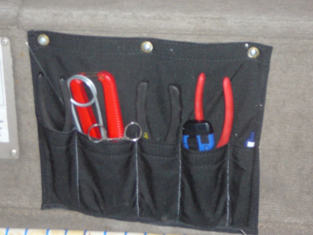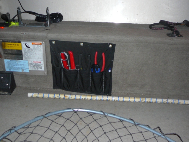 The people who make Rod-Savers make a bag that screws into the inside of the boat that has enough room for Knipex, Visegrips, jawspreaders and more.