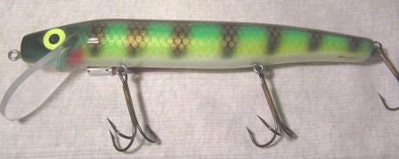 Posts: 1106 Location: Muskegon Michigan | Here are the 4 colors I was talking about. Now it was mentioned aboput throwing a frog colored bait up into the weeds. but that has not been the way it has worked for us. We have tremendous results using Olive frog patterns out on Lake St Clair. Also one many other inland Lakes in Michigan and water color doesnt seem to matter. In 2007 we boated a 30 pound 48 incher on a northern Michigan clear and I mean gin clear lake . We were in 45 feet of water and the lure was out on a Planer board running down about 11 feet. I had a 6 fish day on Lake St. Clair on Olive frog Slashers in 2006 all in 15 to 18 feet of water 5 miles off shore. Murray lake in the middle of Michigan is stained and green and Olive frog is hot there as well. There are no frogs swimming around in 45 feet of water. The spots have a lot to do with why a Musky zeros in on a bait painted with that pattern. But the guy who is looking for a good color for trolling always passes on that pattern unless he has seen it work. W e never leave home with out at least 4 Olive frogs . Kingfisher Edited by Kingfisher 1/7/2009 10:43 PM Attachments ---------------- wbperch.JPG (13KB - 91 downloads) coco.JPG (13KB - 90 downloads) frog.JPG (10KB - 84 downloads) sucker.JPG (13KB - 86 downloads) | ||