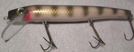 Posts: 1169 Location: New Hope MN | Kingfisher - 1/6/2009 11:15 PM #1 White Belly Perch #2 Coco Perch( brown barred tan body with gold scales) #3 Olive Frog #4 Black Sucker Do you have any pics of these? I can visualize the Coco perch & black sucker, but am drawing a blank on the other two. | ||