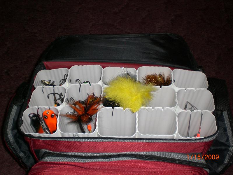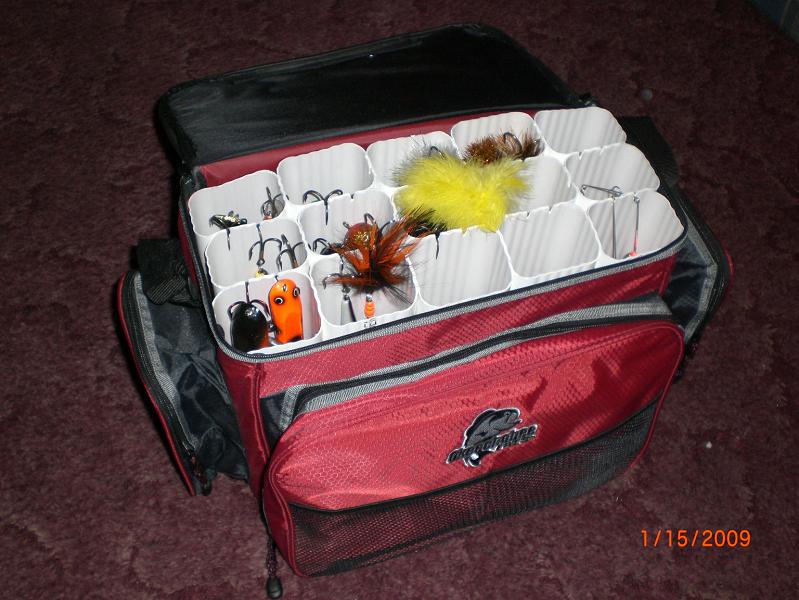 Posts: 134 Location: East TN | Beaver - 1/16/2009 4:26 PM Thay is like the perfect "day bag" to take along if you're going in a buddies boat for a day or a weeked. Thanks, That is what I had in mind with a bag rather than just a regular hard toolbox or something, because its got all the extra pockets and stuff to put my other neccesities. I fish with my buddies alot and we basically take turns on who's boat we go in, so this makes it handy to have anything all in one bag. Just grab and go. | ||