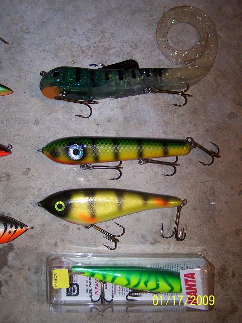 Posts: 233 Location: Iowa | I have a few things for sale. I will have pictures if you would like to see anything. Shipping for baits will $4 for one and $5 for multiple (within US, outside US shipping may be more) and for rods and reels will be for cost. If you have any questions you can PM or email me at [email protected] Abu Garcia 6500 C3 - used/good shape - $55 Abu Garcia 6600 SSC3 - used/good shape - $55 Abu Garcia 6600 SSC3 - hardly used - $75 Fig Rig Toothtamer 7' 1.5-4 oz - $110 Fig Rig Extreme 6"10" 2-6 oz - $45 Cabelas Tourney Trail 6'4" 1-4 oz - $35 GLIDER/JERKS/CRANKS Cisco Kid - walleye - $5 Sand Cat 8" - firebelly - $10 weighted burt - blood perch - $5 AP Lure 7" - perch - $20 Smuttly Dog 7" - white belly perch - sold MI Mag Bulldawg - bluegill - $10 Manta - firetiger - $20 TOPWATER Musky Buster Mag Low Rider - black - $18 Musky Buster Mag Low Rider - Org/gold/black - $18 Thunderhead - black - $15 Mania 9" Doc - black - $5 (has hook rash) Krook - walleye/gold blades - $10 popper 6" long - black sucker pattern - $5 BLADES Muskie Bling Double 10 spinnerbait - walleye/gold blades - $15 Muskie Mayhem showgirl - rainbow/nickel blade - sold Shivers Double Buzz - purple/flame blade - $5 Shivers single buzz - black/flame blade - sold musky buster bulger bucktail - red-chart/red-chart blades - sold Cat Tail bulger bucktail - black-white/nickel-white blades - sold bucktail brand unknown 7" - black/orange blade - $5 slippery sam 10" - black/orange blage - $5 Hunter Tail - purple/gold blade - $5 Pastikas bucktail - blk-white/nickel blade - $5 Thanks for looking, Jeremy Edited by jwelch 1/19/2009 12:01 AM Attachments ---------------- 2009-1.JPG (70KB - 97 downloads) 2009-2.JPG (99KB - 94 downloads) 2009-3.JPG (68KB - 88 downloads) 2009-4.JPG (99KB - 96 downloads) 2009-5.JPG (84KB - 94 downloads) 2009-6.JPG (51KB - 90 downloads) 2009-7.JPG (32KB - 86 downloads) 2009-8.JPG (35KB - 85 downloads) | ||