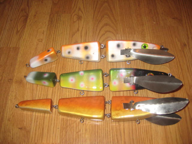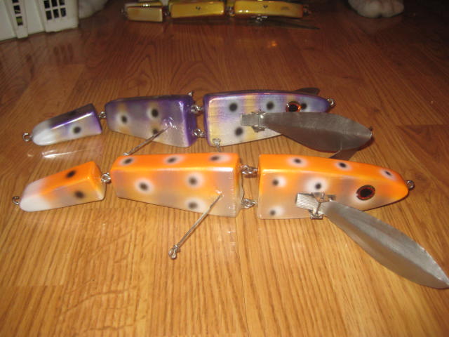 Everything is frozen up here, had some time to finish off some lures. The big creepers are 3 piece 15" western red cedar, some assorted frogs. Hope you like them.