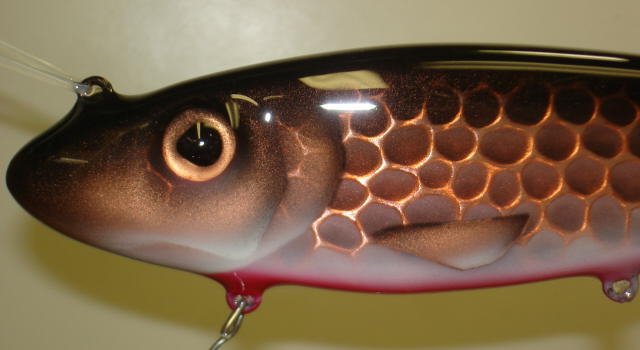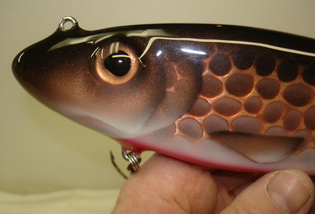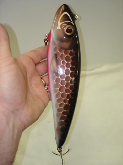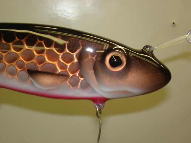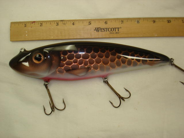 Posts: 399 Location: Burton, Ohio | Micheal I am in for sure! Enough can't be said for the verterans. I often ask myself if I would have had the courage to do what they have done. I am forever grateful! A special thanks from the Snow family! Musky first I appreciate having this great forum. Many many thanks. I have two lures at the moment to donate. Here is the first: It is a copper sided sinking glider / jerkbait. It is 10" long. As it sinks it glides forward. It drops at about a 2 seconds per foot. You can work the water column nicely. It has hand painted glass eyes. Wolverine 3x split rings Mustad premium 5/0 hooks 5 coats of epoxy. Weight 7.25 OZ It is labeled #2 09 John Snow Edited by Tigger 2/12/2009 8:26 PM Attachments ---------------- DSC09174copperwhitefish7.jpg (27KB - 129 downloads) DSC09155copperwhitefish6.jpg (28KB - 132 downloads) DSC09119copperwhitefish10.jpg (32KB - 115 downloads) DSC09115copperwhitefish2.jpg (31KB - 121 downloads) DSC09100copperwhitefish3.jpg (29KB - 142 downloads) DSC09083copperwhitefish1.jpg (32KB - 128 downloads) | ||