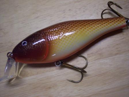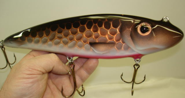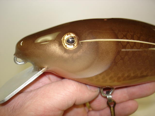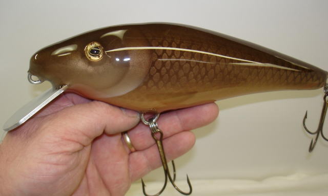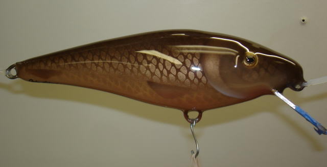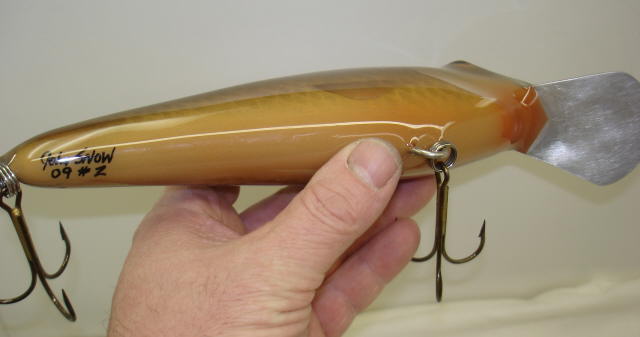 Posts: 399 Location: Burton, Ohio | The second lure is called the "Little Rhino" It is in a carp pattern. It is just over 8" long in the body. Thru-wire construction 3 part synthetic body. 1/8" aluminum lip Glass eyes Wolverine 3x stainless steel split rings. Mustad premium 6/0 hooks weight 7.25 OZ Floating Runs in the 8 to 14 foot nicely and holds the speeds well It is labeled #2 09 John Snow Edited by Tigger 2/12/2009 8:43 PM Attachments ---------------- DSC09238rhinocarp1.jpg (25KB - 127 downloads) DSC09240rhinocarp2.jpg (32KB - 118 downloads) DSC09236rhinocarp3.jpg (22KB - 123 downloads) DSC09075rhinocarp4.jpg (18KB - 115 downloads) | ||