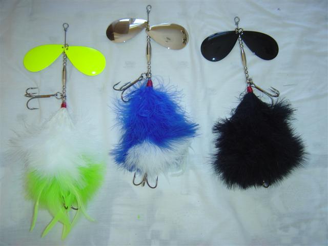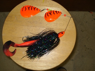 Posts: 131 | lambeau- i'm mailing you these 2 baits for the auction.the flashabou bait has 2 #10 blades and 2 super sharp vmc hooks.the spinner baitweighs 2 oz,has 2 size 10 single hooks tipped with a 6" twister plus a #10 and a #12 blade.they're purty. | ||