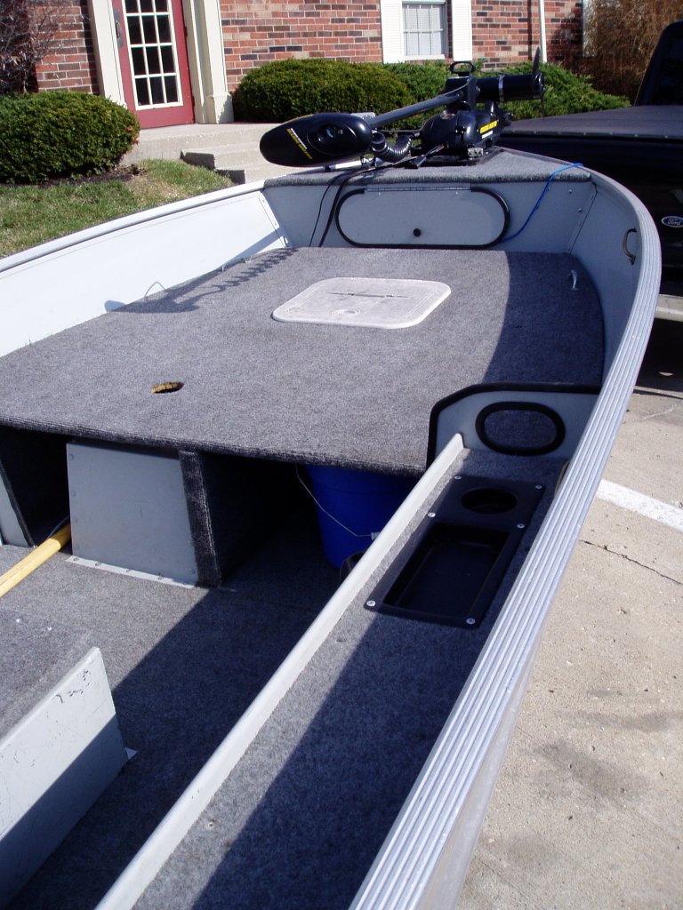 Posts: 73 Location: Indiana | I got my 14 foot Sea Nymph about five years ago or so. It was originally set up as a crappie rig. Low carpeted floor with pedestal boxes front and rear and a livewell in the center. My brother and I built lift in/lift out casting decks. The boat is intact underneath...same condition as I got it. Two people can lift in lift out the decks. Built them with heavy wood...framed them underneath with 2x10's in the back and 2x12's in the front. Set them up in a way to provide support, and dropped a piece of 1/2 inch plywood on top. They sit over top of the pedestal boxes, so we cut holes so we can mount the seats through the raised deck to the existing pedestals. We carpeted them, and then just dropped them in. They weigh enough and they fit snug enough that they'll never come out. And believe it or not, the additional weight in the boat actually makes it MORE stable. I'm taking her out in Indiana waters mind you, so I've never encountered too rough of stuff. But I have been out in 30 mph winds casting. Never had an issue. It's basically a 14 foot casting platform. I'll try to post some pics....see if it works. | ||