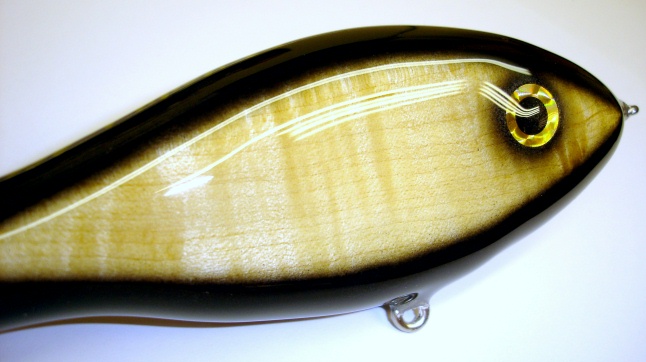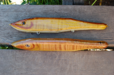 Posts: 4266 | I painted a Brown Trout on a 15" Deepthreat blank by Kingfisher, and back then I said that I was going to go on a quest to find more wood that I could turn into lures with a minimum of paint. I found many varieties of wood that are going to be great lures, but they will all require the usual sealing/painting process. Only a few are going to be turned into lures with a minimum of effort. Exotics like Zebrawood and Lacewood will be made into gliders. One piece of Osage Orange is going to be Jailbird gliders, but I'll have to paint the black stripes, God took care of the rest. The wood that turned out to be the best for gliders and even some crankbaits is Big Leaf Maple. Not as heavy as the usual maple that we use, but every bit as hard. The interesting charachteristic is that you get different kinds of features with the wood. Some have a striping on them that goes in the opposite direction of the grain, and some are figured, producing a "depth" to the figuring that makes the wood appear multi-leveled. Here is a picture of a crankbait that has nothing on it but 2 eyes and the first coat of Envirotex. I have many glider bodies cut from this wood, none of them the same shape because I let the grain guide me when I cut the blanks. Now I have to seal and weight them and even add more to them if I choose, such as shades of color on the back and the face and maybe even some Kameleon scales. Back when I painted the Brown Trout I told some guys what I was going to try to do, and back then I told them that I would call them "God's Gifts" because He's the one that created the pattern, I just found it and turned it into the lure that was hiding. Watch for more gliders in this Baby Muskie pattern as well as a variety of other gifts that I have to unwrap yet. Anyway, here's the first of many. Enjoy the natural beauty that God put in this wood for all of us. Beaver Attachments ---------------- muskiefirst1.jpg (55KB - 92 downloads) muskiefirst2.jpg (57KB - 89 downloads) | ||