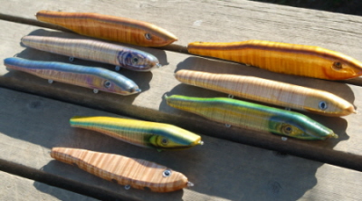 Posts: 4266 | I finally got around to experimenting with some of the wood, though I must admit that my wood-working skills need quite a bit of improvement. Anyway, here are some more of God's Gifts, except this time I applied 2 coats of Etex and could have stopped there, but I added some more to each lure. Even when I apply paint to the wood the stripes still show through, they just change colors. I can't show you what they really look like, because many of them have Kameleon scales that don't show up until they turn in the light. The flat ones I did first, then the rounded ones, where I took a 1 3/8 square piece and routered 3/8 off of the bottom and 5/8 off each side on the top so it's almost rounded completely. The round ones have quite a bit of wobble on the "tap" and even more on the fall because I left so much flat area on the belly. As with any attempt at something new, these are pretty generic, but a have a box full of round ones waiting to be routered, and some 3/4" thick blanks that are going to be big crank baits. Every pattern will be striped in some way, and that's just the way that God intended it when He created this wood. Of all the woods that I tried, this one blows the rest away, with Zebrawood coming in second. Zebrawood makes an awesome glider because in most cases all you need is hooks to make the blanks sink. Once Zebrawood is sealed and coated, the striped pattern still shows through, just like the Maple. I feel like I'm making the lures in reverse, because after weighting and balancing, I'm putting on 2 coats of Etex instead if dipping them in primer. "The first shall be last, and the last shall be first.", I guess it goes for lure making too. Many more gifts from God as they are unwrapped. Flat or rounded? Which do you prefer? It doesn't really seem to matter when you do a baby muskie pattern. I'll have to find out which the fish prefer when I head to Vermillion in June. Might be a good time to throw some Pike flavored gliders. Beav Attachments ---------------- Group of Gifts.jpg (82KB - 95 downloads) Gifts.jpg (94KB - 83 downloads) DSC_0139.JPG (91KB - 88 downloads) Flat Muskies.jpg (94KB - 84 downloads) | ||