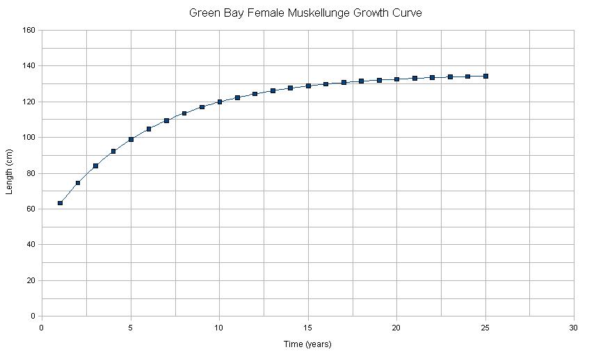 According to (ex-biologist) Kapuscinski et al (2006), the maximum length that the average female musky can achieve in Green Bay is 1355 mm, or about 53.3 inches. Now we all know of fish caught out there that are larger--but this is the predicted length of the *average* female. That paper also give the von Bertalanffy equation for the female fish as: