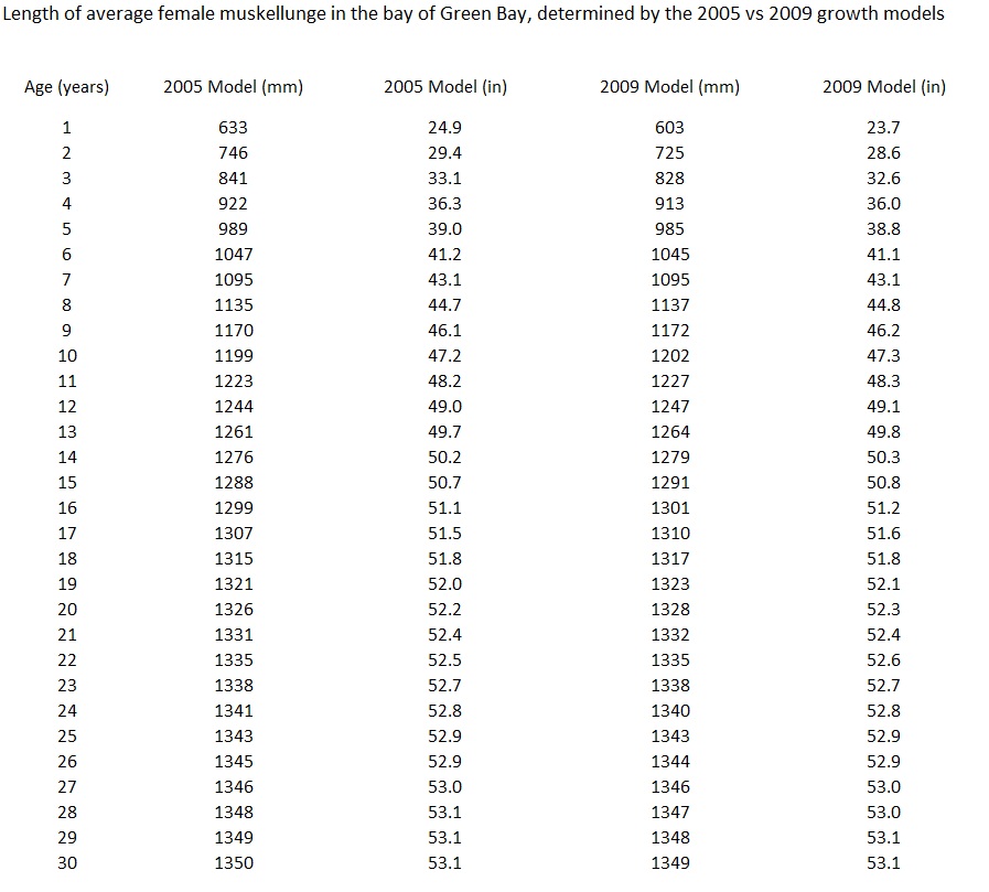 I received some updated data from our local fisheries biologist about two weeks ago. The data included the newest growth model for the population in the bay of Green Bay, through 2009. To his knowledge, this is the latest revision of the growth model that exists. Therefore I have calculated the average length at age of female muskellunge in this population, using both the original model (2005, referenced above) and the newest model. The results are shown in the two tables I am attaching to this post.