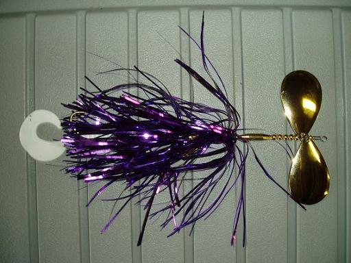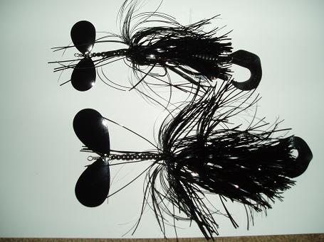these have the heavy .040 blades and the thick cut saltwater flashabou. I use a treble on the top hook and a single hook on bottom with a kalins trailer. these baits run nice and deep.