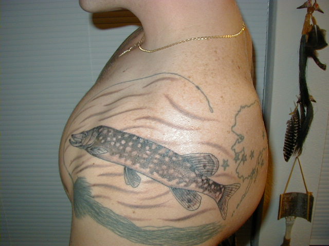 Posts: 1663 Location: Kodiak, AK | I was a pike guy before I was a a muskie guy, so.... I like just the standard "textbook" image and not the fish jumping out of the water with a bait in it's mouth or anything like that. I'd like to get a muskie above my pike this winter sometime. We'll see... Attachments ---------------- pike tattoo.jpg (57KB - 8100 downloads) pike tattoo1.jpg (58KB - 481 downloads) | ||