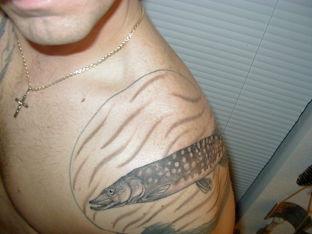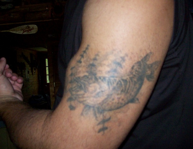 Posts: 294 Location: Bloomer, Wi | here is my musky tattoo that I got 7 years ago when I was 19. My mom and I drew it up. I passed out in the first 30 seconds and I told the tattoo artist to stop I didnt want it any more the pain was too much but he convinced me to keep going. Im glad I did. Attachments ---------------- joes tattoo.jpg (107KB - 617 downloads) joes tattoo close up.jpg (122KB - 701 downloads) | ||