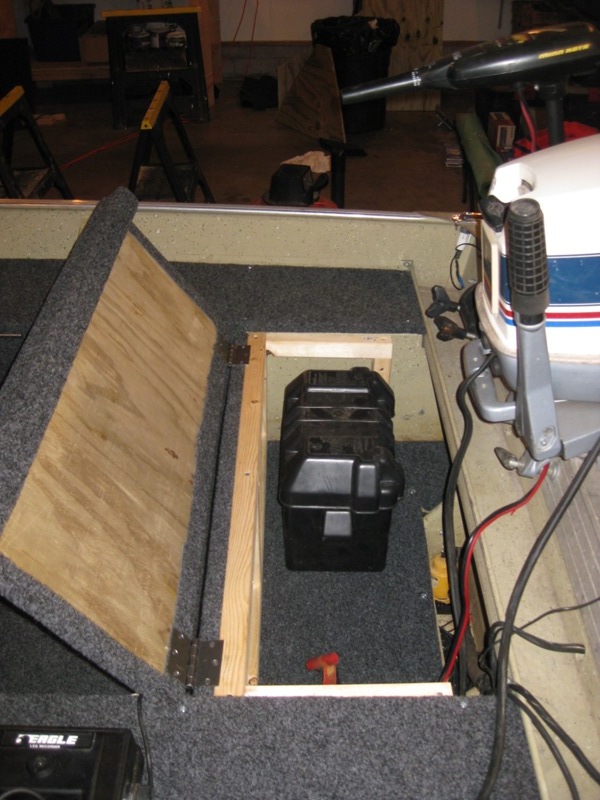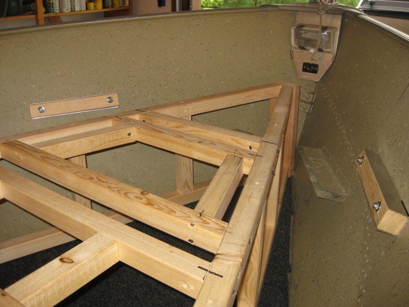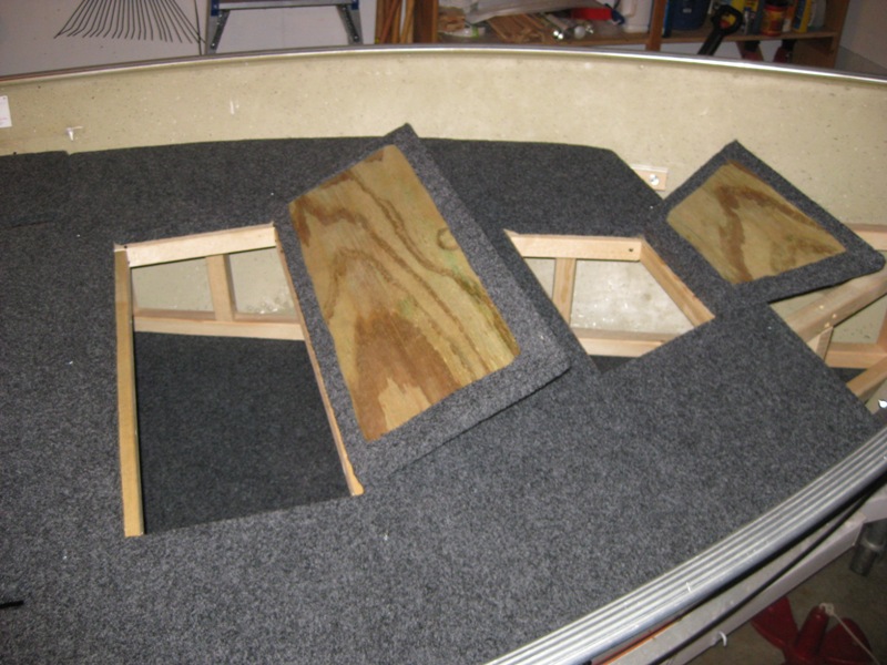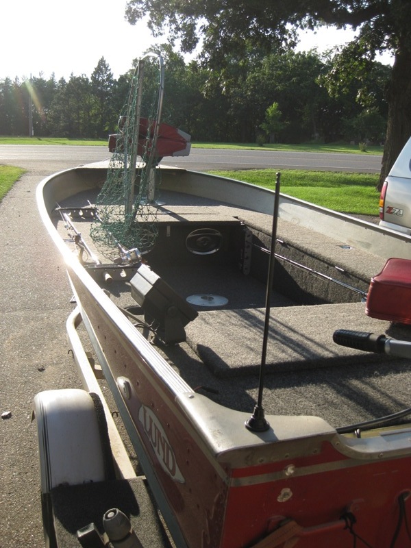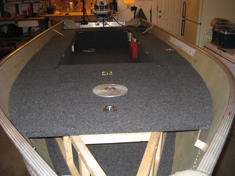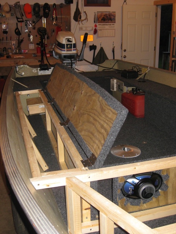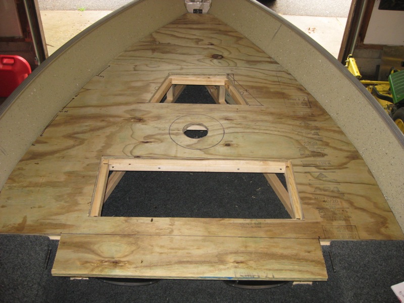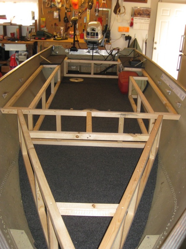 Posts: 158 | Wow....very cool that you brought this up. I just finished a mod on a mid 80s 16' Lund....check it out...here are some ideas for you! I got home from a 2 day fishing trip and decided the boat was just not functionable so I gutted it. I had the idea for this in my head since the day I bought it. This boat was modified with musky fishing as the main priority! I can stow a 9' rod on the right side locker with the tips going under the front deck...not too many 16' boats have storage for a 9' rod! Half of the rear casting deck is removable. I didn't want to frame around the control panel and wanted to be able to have more storage underneath it that wasn't restricted by being framed in so I did it half and half. The rear half of the back deck is the starter battery storage, tools, extra prop, etc. The rear seat pops right off and stows under the open half of the deck so the rear deck is completely unobstructed. The bow mount trolling motor batteries will go under the big hatch on the front deck and there is still a ton of storage under there. Both side lockers offer lots of storage as well....basically I wanted the boat to have the ability to be completely clutter free so nothing is in the way while muskie fishing. I still have to get the bow mount troller hooked up but other than that this boat is ready to rock and has already had a 41" fish in it! On materials I probably spent right at $500...maybe a bit more. 5/8 green treated plywood for all the flat surfaces, and 1/2" for the verticle surfaces just to save a little on weight. The 2x2 framing weighs nothing and is totally ROCK solid. The carpet was from Mills Fleet Farm. I used the old wood floor for a template for the new floor and cardboard for the front deck and tops of the side lockers...just cut it to fit, lay it on your sheet of plywood and trace around it, and cut it out with a jig saw. If you have any questions at all don't hesitate to ask...I literally just got done with it so all of it is fresh in my head. Have fun man! I loved doing this project! Edited by Shoot2Kill 8/25/2009 9:19 AM Attachments ---------------- Mod1.jpg (134KB - 245 downloads) Boat (3).jpg (140KB - 350 downloads) Boat (9).jpg (180KB - 608 downloads) Boat (23).jpg (150KB - 326 downloads) Boat (30).jpg (135KB - 1018 downloads) Boat (38).jpg (144KB - 246 downloads) Boat (40).jpg (140KB - 234 downloads) IMG_1952.jpg (178KB - 232 downloads) IMG_2018.jpg (158KB - 227 downloads) IMG_2021.jpg (177KB - 227 downloads) IMG_2017.jpg (167KB - 191 downloads) IMG_1953.jpg (142KB - 198 downloads) Boat (34).jpg (137KB - 291 downloads) Boat (41).jpg (155KB - 211 downloads) Boat4.jpg (173KB - 211 downloads) Boat4.jpg (173KB - 191 downloads) | ||