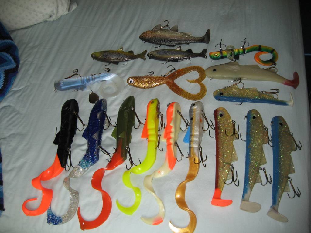 rubber = (1) pounder (2) Shack attack pounder size baits, (2) Mag Dawgs, (1) mag heli dawg, (1) Super D (repaired), (1) twin fin, (1) alien eel. (2) Nibblers, (1) MattLures Custom trout, (5) Shimmy shads = $100 + shipping