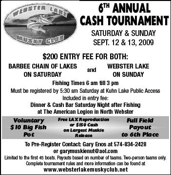 hey everyone the webster lake musky club is havine its 2nd cash tournament of the 09 season.. on september 12th and 13th.. barbee chain on saturday and webster lake on sunday.. and a dinner on saturday night.. 200.00 a team and 60% payout to a full field.. hope to see everyone there... check out the pic of the flier...bill