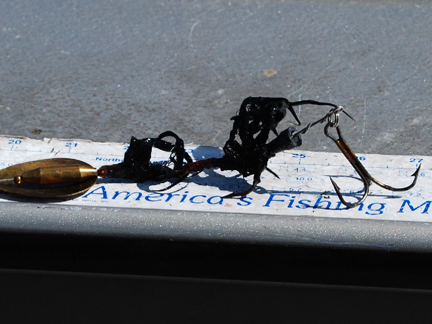 when I got done with a couple quick pics after unhooking and started putting my tackle back together, I found that my mangled bootail was missing one of the front trebles. It was a suicide hit from this fish, coming from below, behind, and slightly to the right of the bait, accelerating and gulping the bait, then turning away, resulting in a near perfect hookup for me, evidently not quite so good for the fish. I am guessing I broke the hook off myself during unhooking, though a straightened back treble may have implicated the fish itself, during the fight.