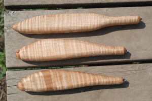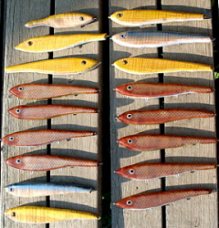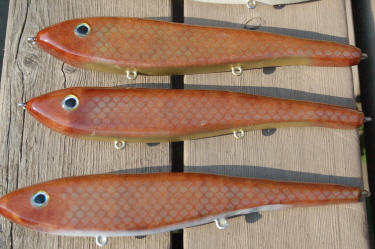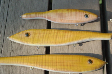 Posts: 4266 | The 1" thick ones that are in the pictures aren't too bad, but I made the Redwood ones and a batch of really highly figured Maple ones about 1.5" thick so they more resemble a real fish and they weigh it. Funny thing is once they hit the water they don't weigh much at all. I just finished sanding some a little while ago, so after I seal them I'll put a picture and you can check them out. I have to add some green highlights to the muskie/pike ones before I add some more E-Tex. I should have some for sale in a couple of weeks. Just in time for hot glider fishing........and of course, I have to keep a few. Beav | ||