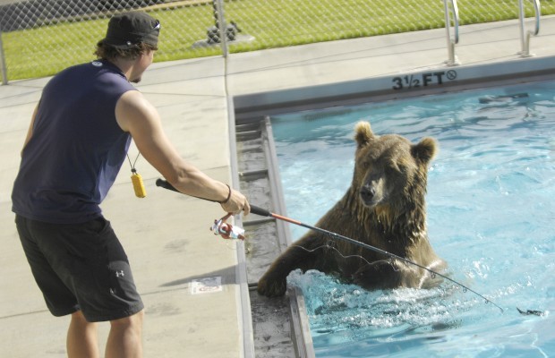 Got a new use for my musky lures. Teaching a grizzly to fish/catch trout. New way to test the durability too! LOL