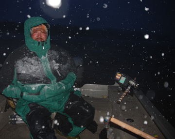 Posts: 692 Location: Pelican Rapids, MN | I like the cloudiest blustery days. Yeah, it stinks fishing in it but when the snow falls the giants eat! Sun can activate fall cold water fish, but they can often be illusive, going to either extreme shallow or extreme depth - depending on what type of lake you are fishing of course. It seems to me when the weather is nasty, the fish predictably hold certain parts of structure - Almost to the point where you can call your shot. Of course there is an exception to every rule. This is what a miserably perfect day looks like. Taken two weeks ago, and yes that is ice on my chest. Edited by Jsondag 10/22/2009 10:19 PM Attachments ---------------- DSC_0058_2.JPG (32KB - 161 downloads) | ||